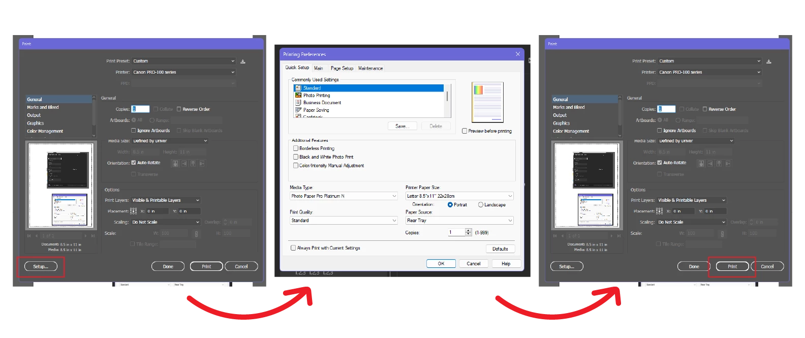 Basically, when I go to print in Illustrator the normal print dialogue still pops up (although takes much longer now). However, my issue is that when I click "Setup" to choose my printer settings, this dialogue now appears before the normal printing preferences window does, and again after, and as a result negates the paper size I just changed. Here's what my old workflow looked like: