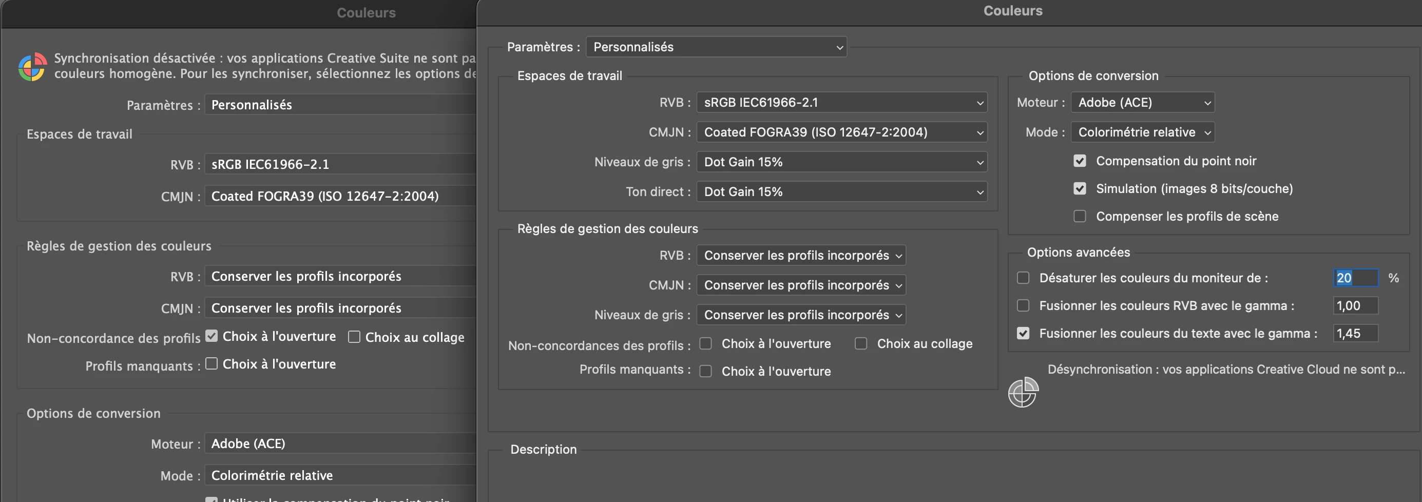 left: illustrator color setting ; right: photoshop ones (sorry the interface is in French, I hope it's still in order for you regarding the color info?)