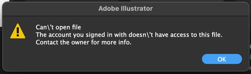 Certain files that are saved on my Adobe Illustrator has a gray cloud sign in right bottom corner. What's more, every time I'm trying to open that kind of file I see very strange information 'Can't open the file, The account you signed in with doesn't have access to this file. Contact the owner for more info' but... I'm the owner. Can somebody please tell me what is going on and why Ai keep on doing that cause I'm starting to lose my mind...