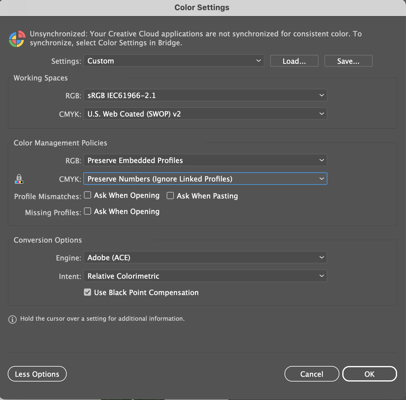 We have tried both CMYK and RGB and they almost identical. All other colour settings seem to be greyed out.