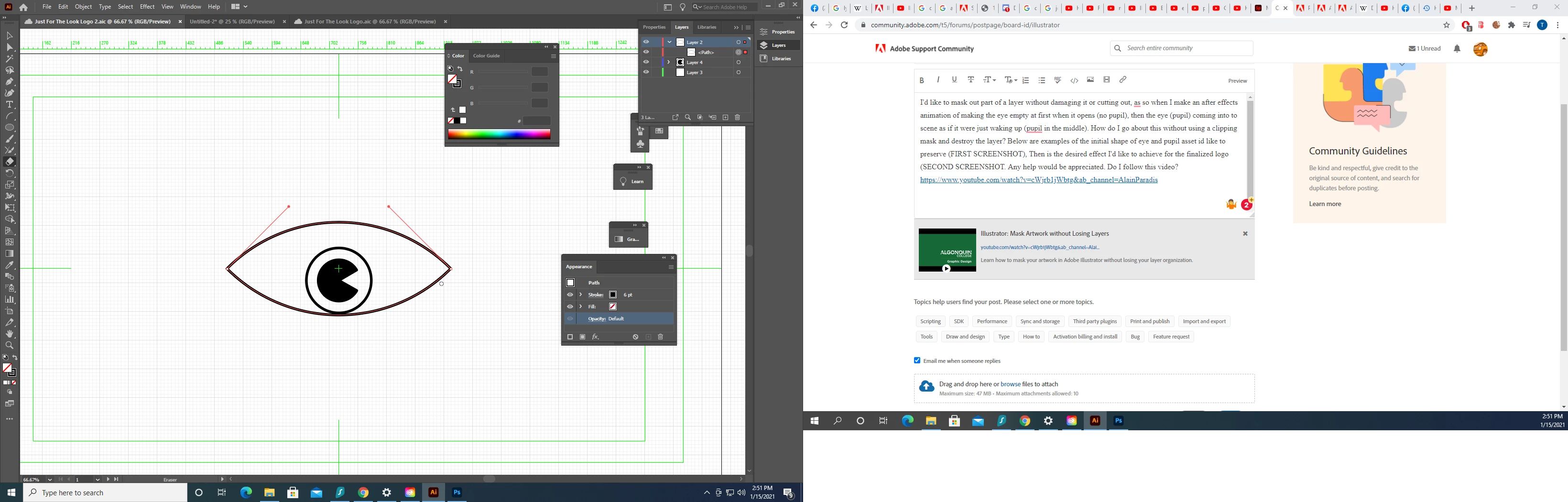 I'd like to mask out part of a layer without damaging it or cutting out, as so when I make an after effects animation of making the eye empty at first when it opens (no pupil), then the eye (pupil) coming into to scene as if it were just waking up (pupil in the middle). How do I go about this without using a clipping mask and destroy the layer? Below are examples of the initial shape of eye and pupil asset id like to preserve (FIRST SCREENSHOT), Then is the desired effect I'd like to achieve for the finalized logo (SECOND SCREENSHOT). Any help would be appreciated. Do I follow this video?