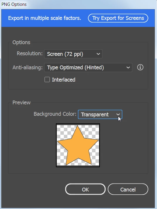 2. If yes then choose File>Export>Export for Screens. Choose PNG. This should be export with a transparent background. If it is not, then check your option using Advanced Settings by clicking on the gear. Make sure the Background Color is set to Transparent.