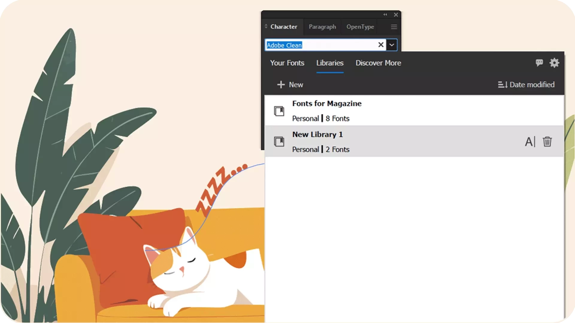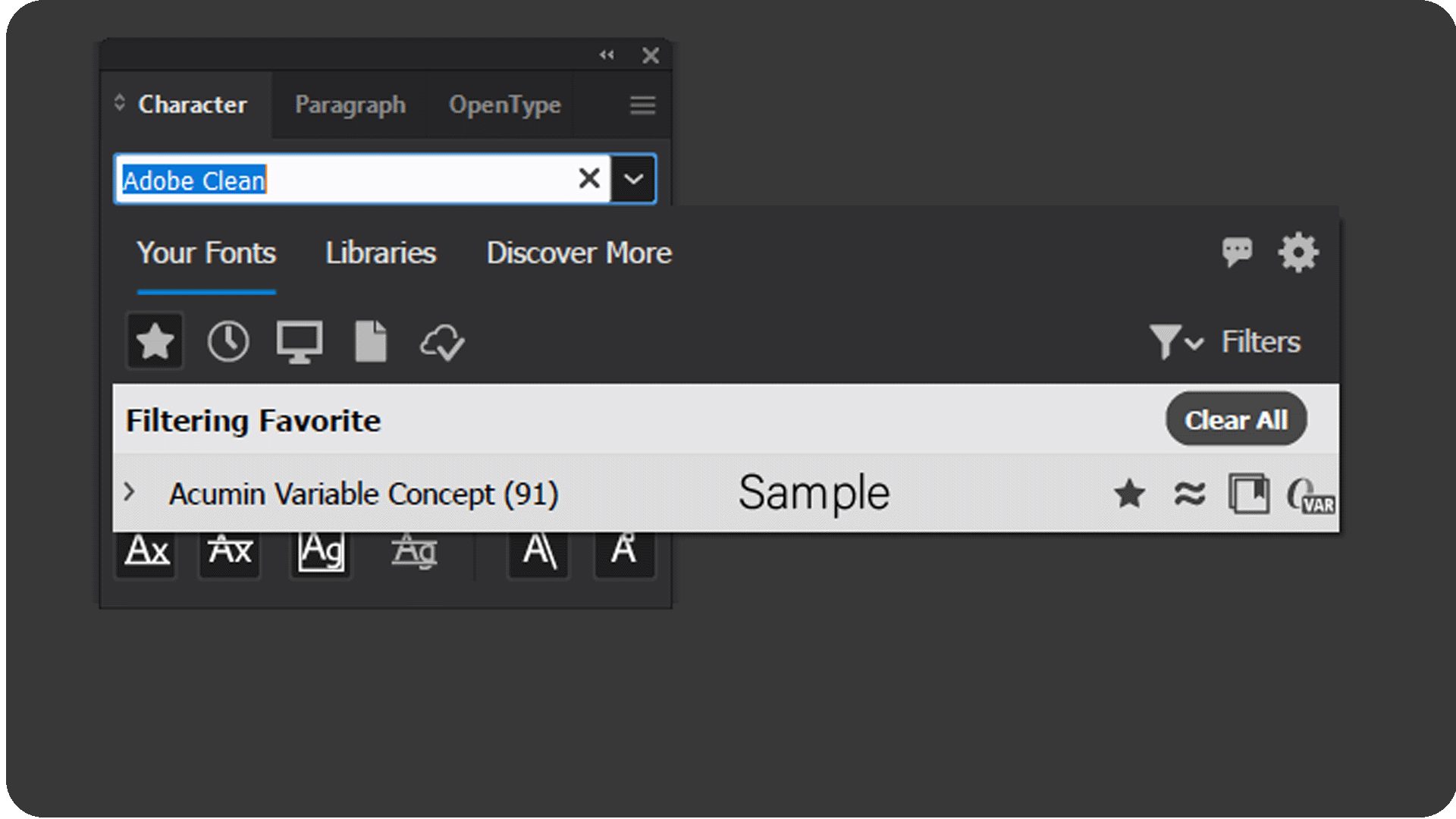 The Libraries tab in the font browser lets you organize fonts using Creative Cloud Libraries. You can use existing Libraries or create new Libraries within the Libraries tab.