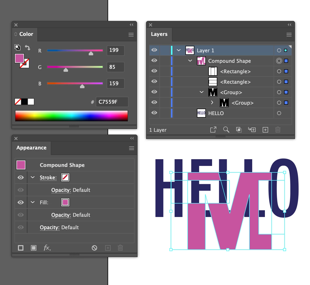 I'm trying to recreate this technique where multiple shapes (in this case, two rectangles) are masking out parts of another shape (the M). The entire shape (the M plus the two rectangles) are set to the same purple fill color. I have no idea how the original designer did this. Any help would be highly appreciated, thanks!