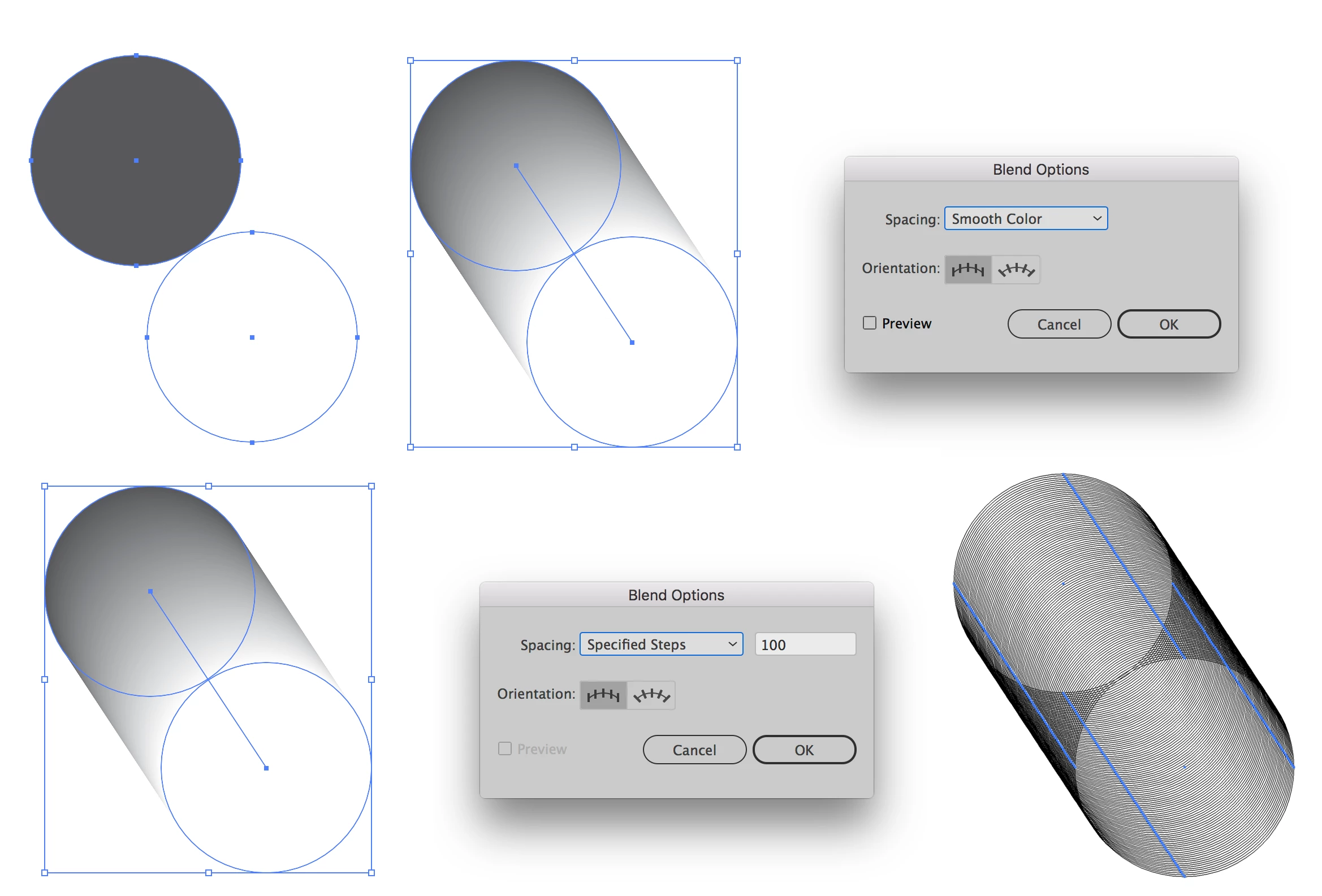 In the first example I used the Blend Options (Found through Object Menu>Blend) to set up the Smooth Color method. This way will usually provide a blend smooth enough for most uses. The second method used Specified Steps and I (arbitrarily) chose 100. In either case the keyboard command Option/Alt-Command/Control-B will apply the blend after you've chosen the blending method. The third option in the Blend Options Dialog Specified Distance does not apply to what you've asked about. In either of the cases above if you want to expand the blend to live Illustrator art you can select it and choose Expand under the Object Menu.