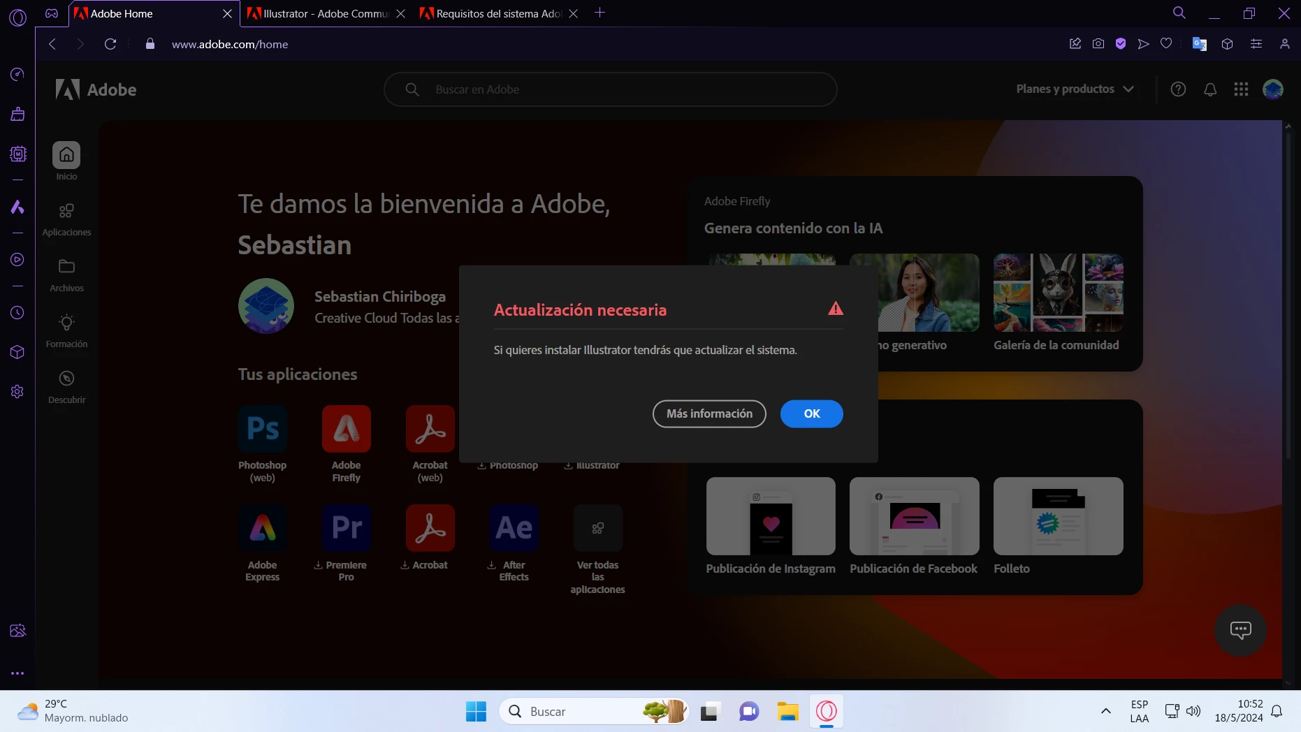 Ayer compré los programas de Adobe como estudiante, pero no me deja descargarlos por el sistema. requiere windows 11 21h2 o 22h2, y yo tenía la versión 23h2. Decidí formatear la pc para regresar a la versión 22h2, pero a pesar de ya estar en la versión que exige Adobe, sigue saliendo el mismo problema.