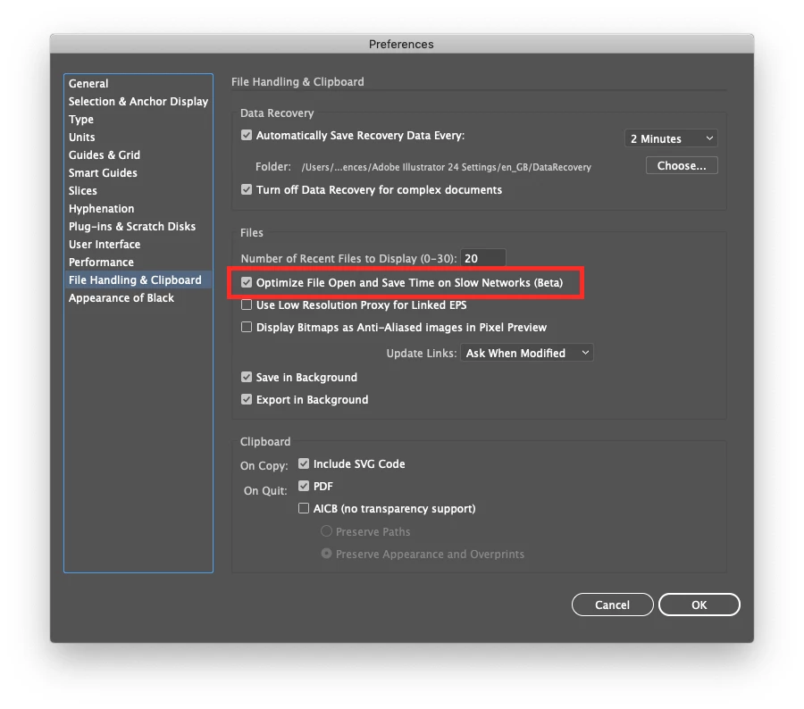 Recently, the illustrator cc2019 and 2020 versions have been updated, and it is found that the "optimize file open and save time on slow networks (beta)" function has been added to the software. The literal explanation is not very clear about its purpose, and the official website does not explain in detail. Now, do you know the function? I want to know what is the main purpose of this function? What is the difference between enabling and not enabling? Will the original file content be affected if enabled?