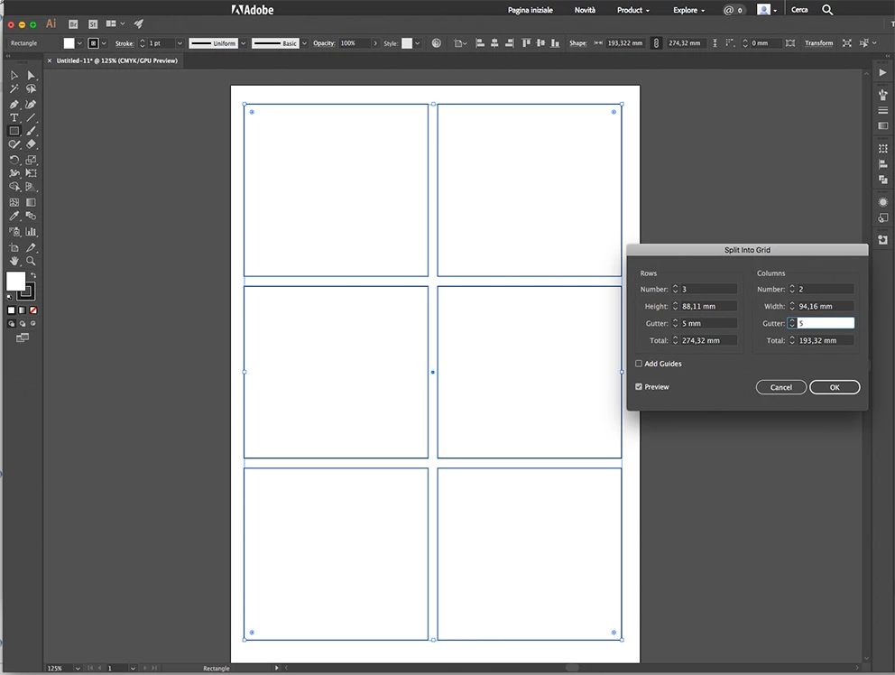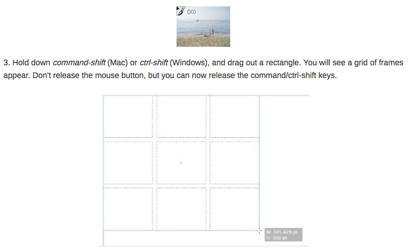 Draw an object with the dimensions you want for placing the photos, then select menu OBJECT > PATH > SPLIT TO GRID