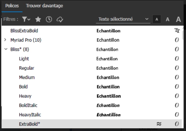J'ai un soucis concernant l'installation d'une police : La Bliss Extra Bold. Je ne comprend pas pourquoi Illustrator met un asterix ? Pourtant je l'ai bien installé sur mon PC du travail. Je vois aussi qu'il y a une police similaire mais qui n'est pas dans la famille de "Bliss" : est-ce qu'il y a un conflit entre ses 2 polices ? Je ne comprend pas... Merci beaucoup pour vos retours.