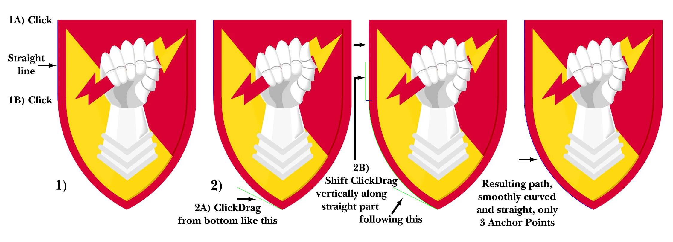 Then 2B) hold Shift and ClickDrag vertically up from the bottom end of the straight part (Smart Guides say anchor first and then on); the Anchor Point is marked with a short horizontal blue path, and the length and direction of ShiftClickDragging is marked with a separate vertical green path, and the actual ShiftClickDragging forms part of the curved to vertical green path so only the topmost part of the original blue pathe shows;