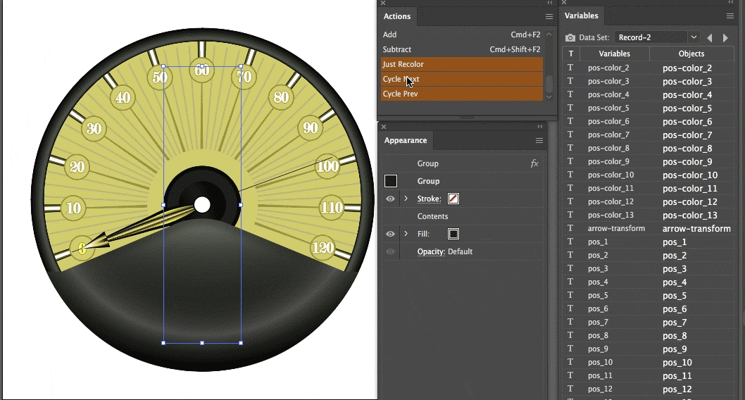 For ultimate control, you can also add the use of this script-based technique which also uses variable data. This would be an unorthodox and exciting use for variable data which would truly differentiate Illustrator's variable data abilities from that of InDesign. With it you could accomplish things such as randomized sets of characters with synchronized or randomized dance moves - you'd have to shuffle the data to suit yourself inside of a spreadsheet program, but that's how you can turn a standard piece of art into an extrapolated & uniquely styled variations.