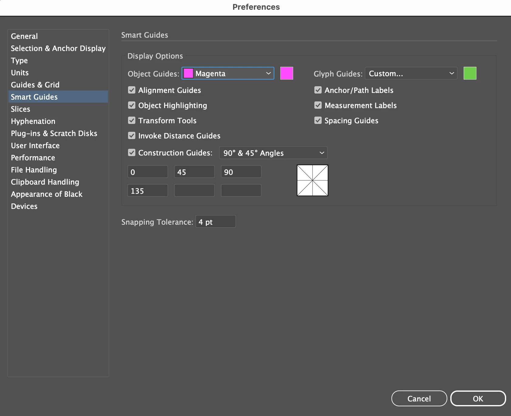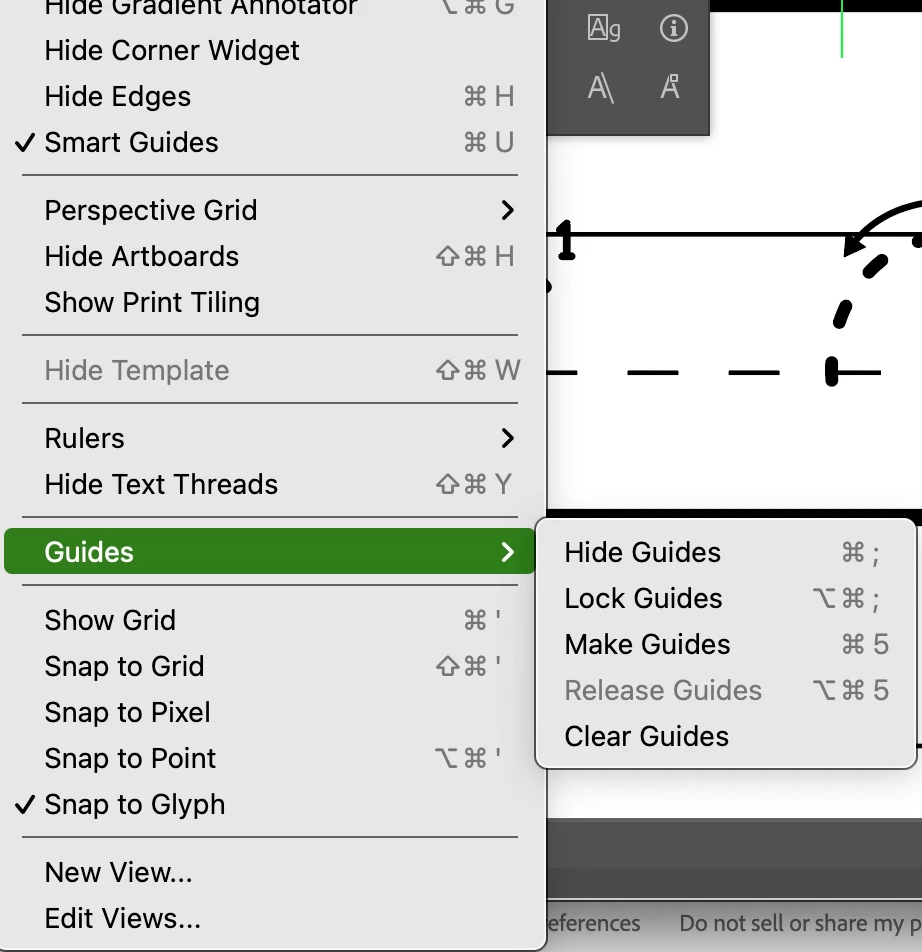 I'm using Illustrator 2025 on OS 15.3. I've read all the posts on this and have changed all my guides accordingly. I've also restarted Illustrator. The pink smart guiades are showing but the green glyph guides are not. Some of my text has been Outlined and others have been Expanded.