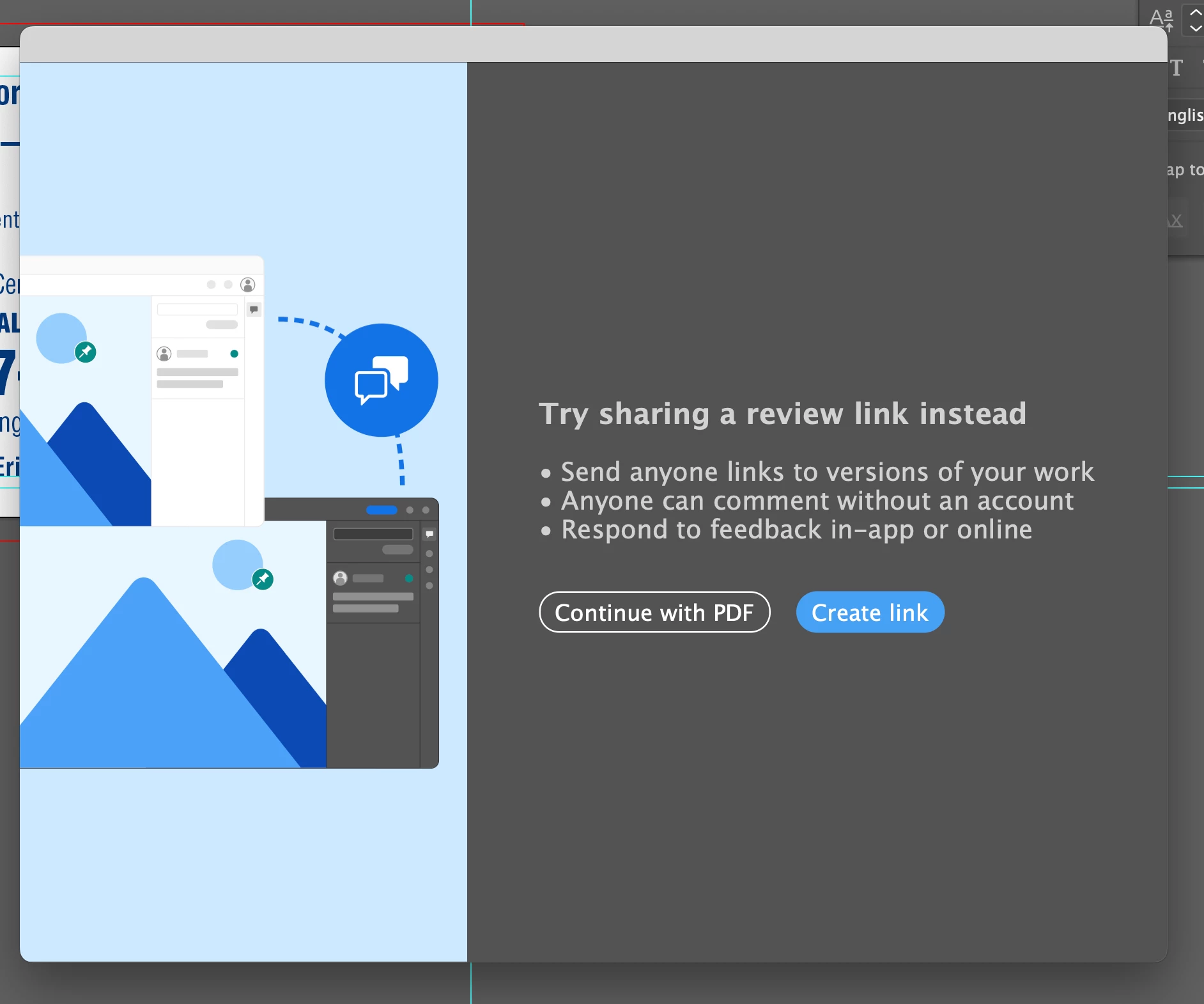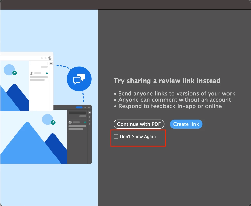We are pleased to announce that we have resolved the issue related to the Share for Review modal in Illustrator. We have added a "Don't Show Again" checkbox option on the 2nd instance of the modal.