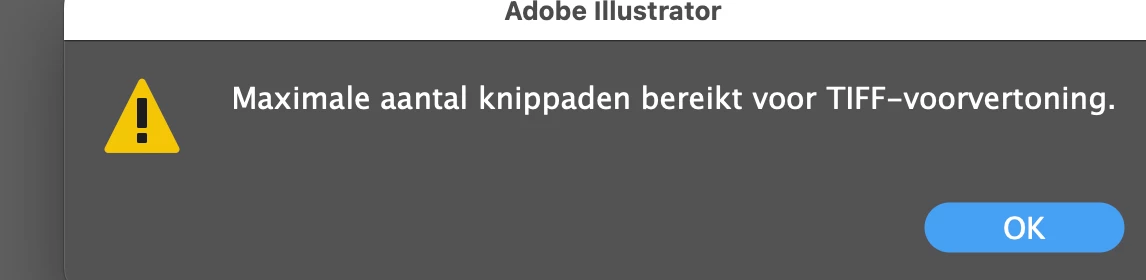 Every time I safe an Illustrator file with several pages, I get a warning saying "Maximale aantal knippaden bereikt voor TIFF-voorvertoning", in English that would be someting like "Maximum number of cutting paths reached for TIFF-preview". Dies anyone know what it means and how to prevent it or what I should do? There is no "Don't show again option".