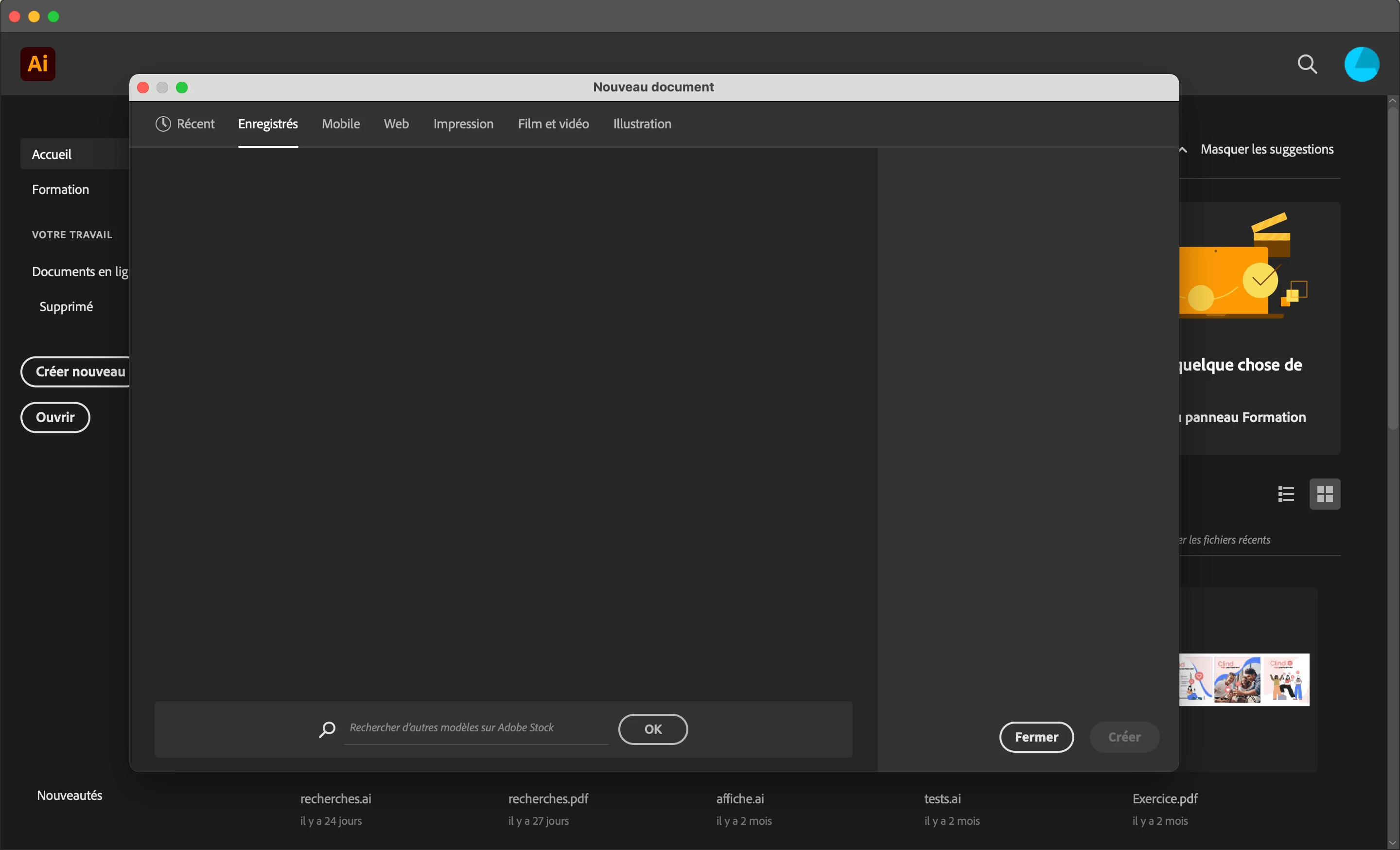 I work really often on a specific document so I wanted to create a template for it. I created my new document and saved it as a template (on the path by default). But when I re-open illustrator for testing this new feature, nothing appears on the tab "saved" which is, I think, the tab where I can found my templates. Here is the screen :