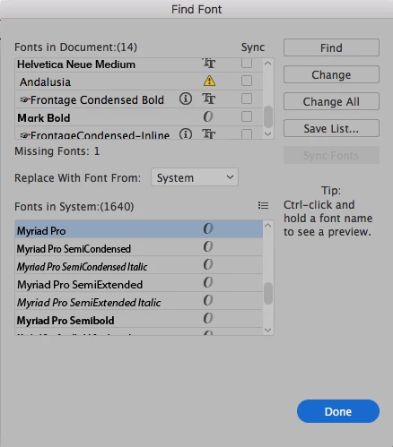 I want to choose which font to substitute. I actually have the font, but it's named something else. I have D-DIN - Italic, which is EXACTLY like DINPRO-Italic. Same exact font, different name. When I open it, it randomly selects a substituted font. So annoying. I rather choose which one. Anyone help?? And no, I do not want to place the file to convert the text to outlines.