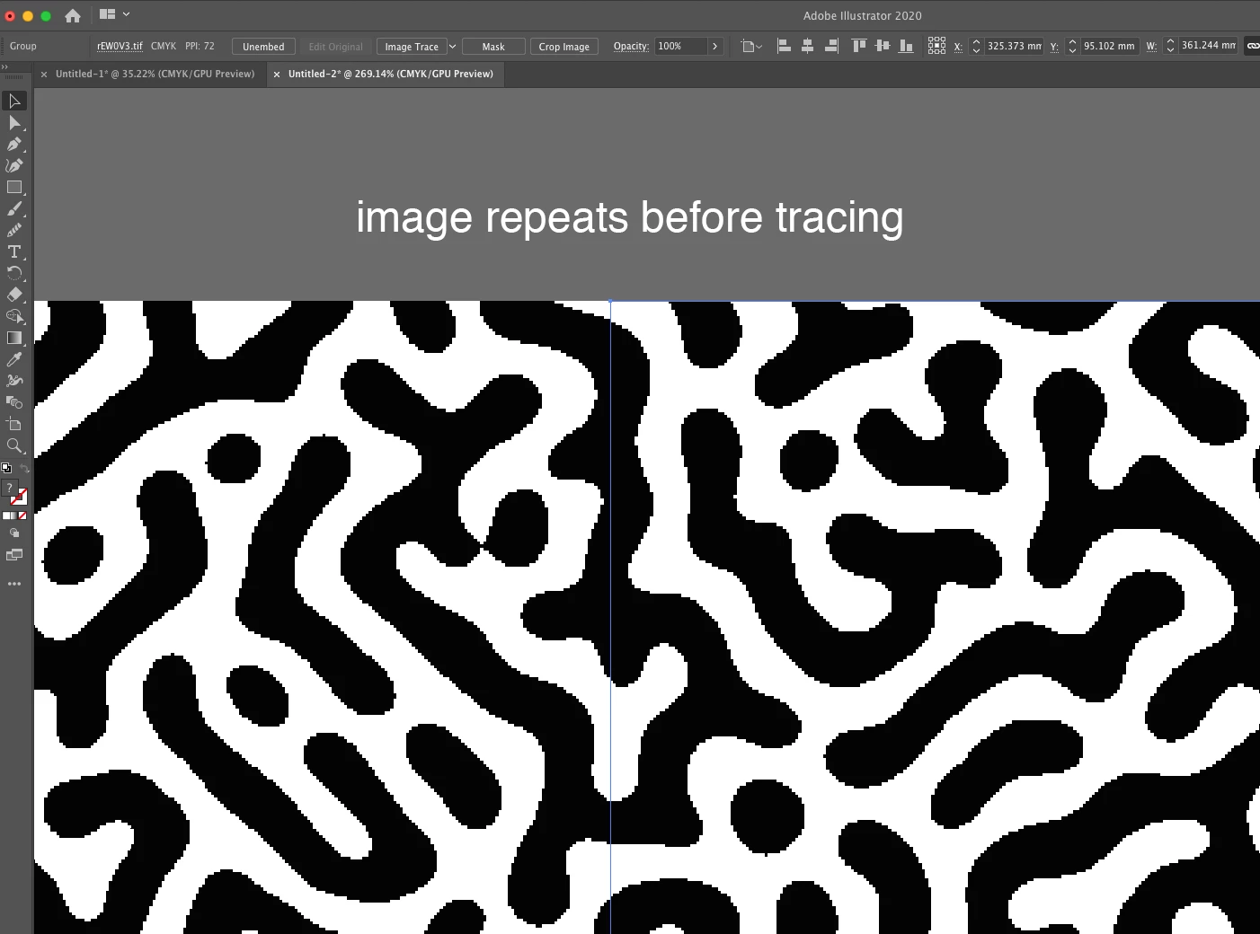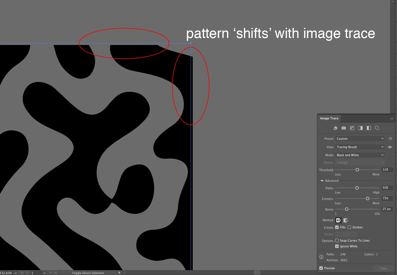 I'm trying to create a repeating 'Turing' pattern using PhotoShop and Illustrator, following an online tutorial. Having pasted my pattern form PS to Ilustrator, I'm attempting to apply image trace as per the video instructions, but every time I do the tracing result appears to 'shift' slightly, meaning the pattern does not repeat seamlessly. My image trace settings are as per the tutorial (included in screenshot), anyone able to tell me what I'm doing wrong?