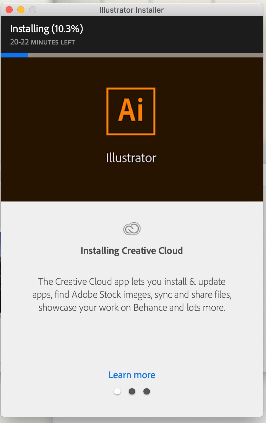 my problem is that i can't install any of this products in my iMAC and am not geting any error but the installation is stack on 10.3% for an hour now. photo attached.