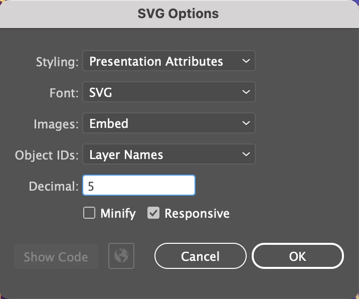 Here are my SVG settings, though I will admit I do not know what I'm doing when it comes to SVGs: