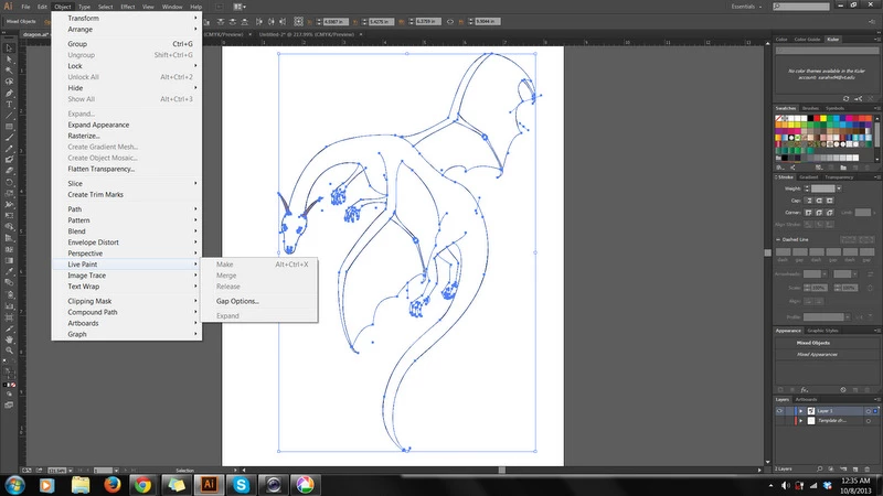 I'm fairly new to Illustrator, but for a project I'm working on I've drawn a dragon using the pen tool. Now I want to use the live paint tool, however, after I select my dragon it won't let me "make" the live paint. I also can't expand, not sure if that's related.