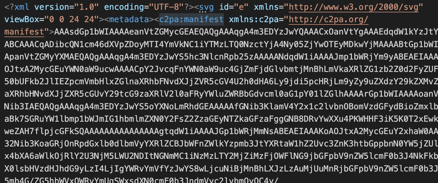 When I export an artboard as an SVG from a particular file (attached), using either Save As or Export for screens, Illustrator is including a metadata tag and a c2pa:manifest child tag, which includes an enormous string value: