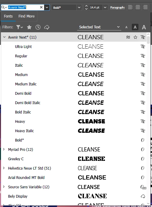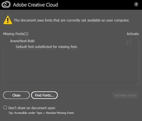 But when I go into the AI file I was given, all of the font family shows up except for Avenir Next Bold, which it shows as missing. This is true in every Adobe program I have tried ie. Photoshop, and InDesign so far.