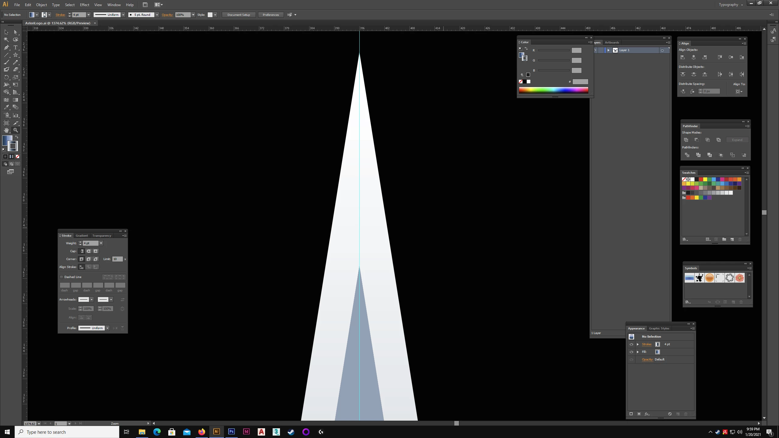 This is more of a paranoia than a real issue. I've drawn a logo and i'm wondering why it appears as if it's not symmetrical when I align it to horizontal center and have a guide in the center as well. I've used Illustrator for a long time and more to the point; have drawn a lot in Illustrator. I meticulously drew this logo with care and I THINK I have the answer, but I would like someone to give me a reason for why it appears this way. Even while studying graphic design I ran into this issue. It seems like a slight glitch? Usually this happens on high zoom levels but it's kind of apparent regardless. The logo doesn't seem symmetrical and seems to go slightly right. I actually redrew this logo over again, with the same result. Only the first time it was actually worse and didn't align with the center guide altogether.
