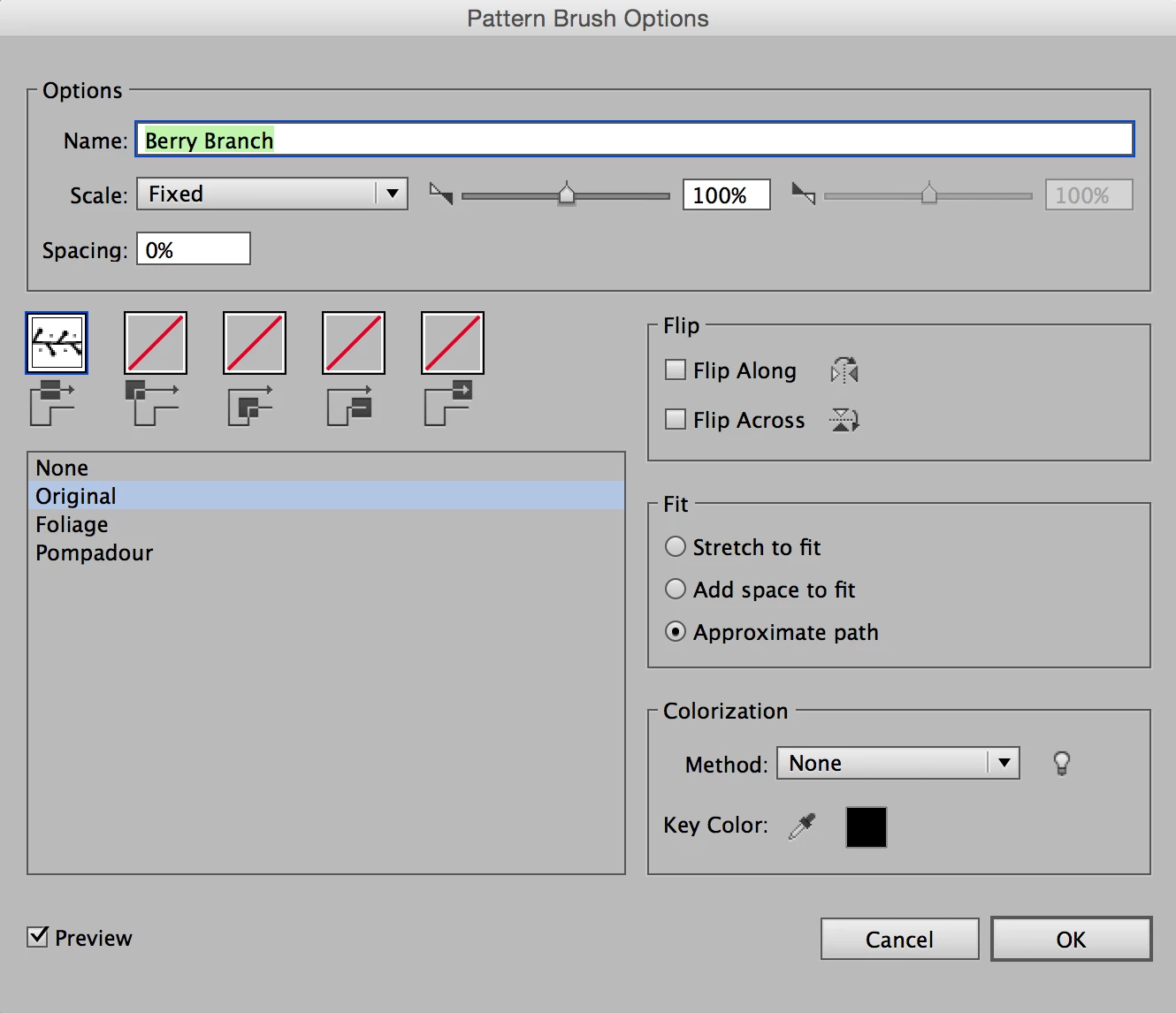 According to the tutorial, using my specially drawn mini doodle, when I click to make a new Pattern Brush, the only setting I should be changing from the default is under the 'Fit' section, from the default 'Stretch to Fit' option to 'Approximate Path', which I've done as you can see here.