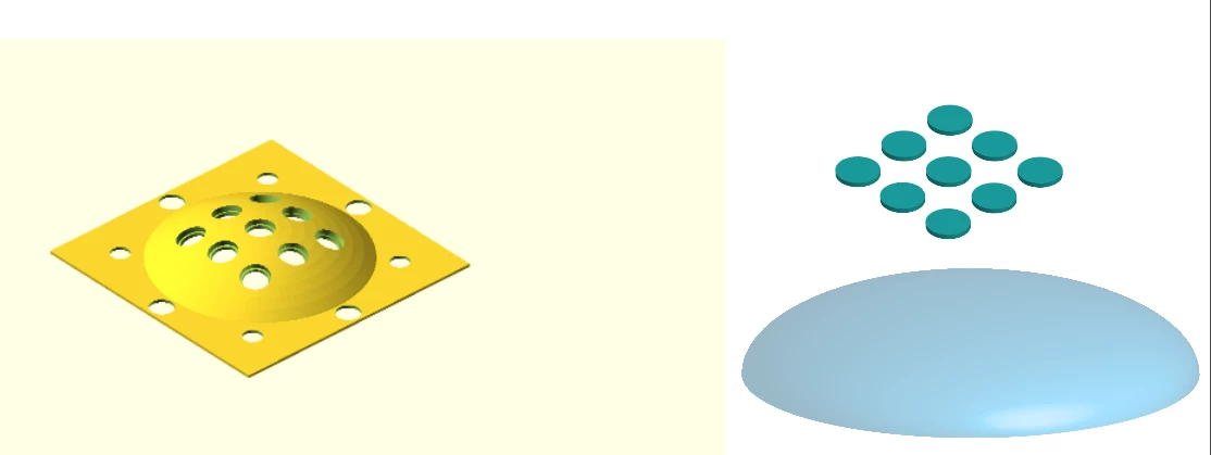 I have an image from a CAD design I made and want to replicate (on the left). I tried to recreate the image with some sort of combination of a 3D hemisphere and some holes in AI (on the right). I tried making a 3D hemisphere and using "map art" to map the holes, but never achieved the desired result. I also tried using warp -> fisheye, but that distorts the circles themselves. Ideally I would like to map something onto a spherical/curved surface. Any tips how I could do that? Thanks