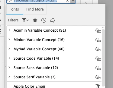The AcuminVariableConcept.otf, MinionVariableConcept-Roman.otf, SourceCodeVariable-Roman.otf and SourceCodeVariable-Roman.otf are installed in the Illustrator application and are required fonts for InDesign.