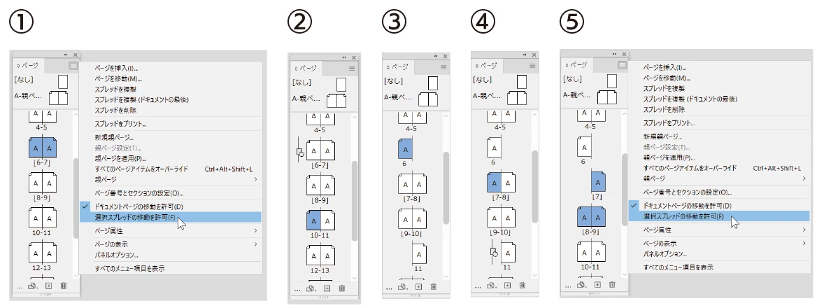 どうしてもページ移動を行わなくてはならない状況で、見開きの左右を移動させたくない場合は「選択スプレッドの移動を許可」のチェックを適宜外してページを移動させてください。次の手順になります。