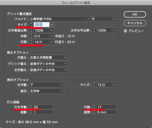 最後に、フレームグリッドは本来、「ここからここまでの幅で入るだけ入れる」という用途とのテキストフレームとは違い、「文字サイズと行送り値と行数を指定して作るもの」です。