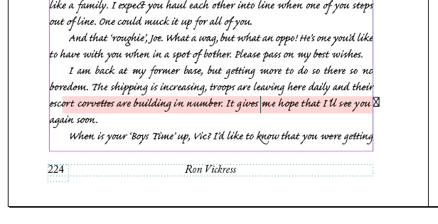 I know pink highlighting means a font is missing. Or usually does, or commonly does, or something. I have a problem where just one section of one line is pink highlighted. The rest of the type in that style is fine. The 'Find Fonts' box tells me the font is present. What's going on? The screenshot below shows the bottom third of the page on which this is happening.