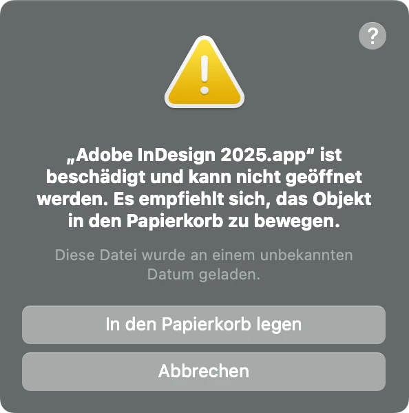 Adobe InDesign 2025.app ist beschädigt und kann nicht geöffnet werden.