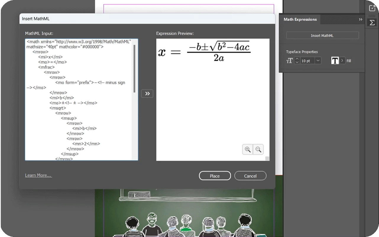 We are thrilled to introduce the new MathML feature in InDesign. Now, you can easily create, style, and edit math expressions with the new MathML panel. Seamlessly integrate complex equations into your documents, styled to match your text. Perfect for scientific and academic content!