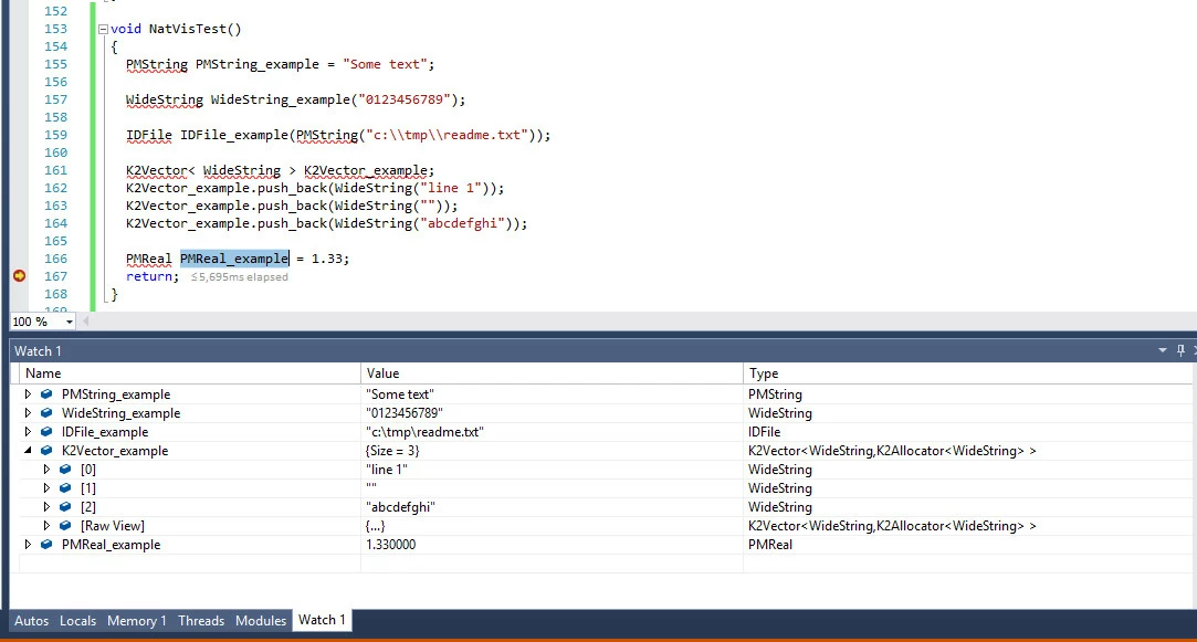 I have created a natvis file ( replaces the old autoexp.dat), for now the classes supported are PMString,WideString,IDFile,K2Vector,PMReal (I will add more in the future).