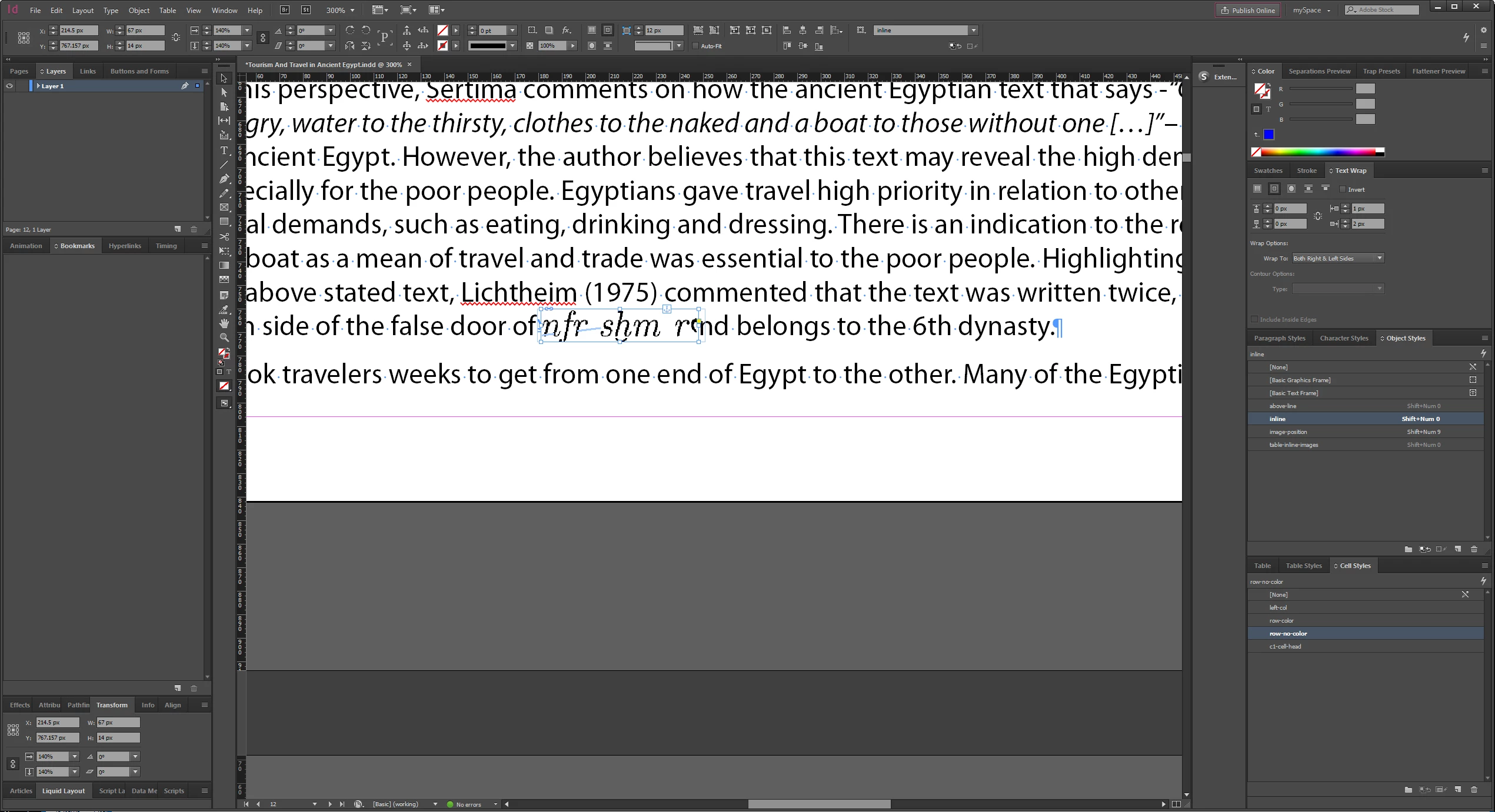 I'm assembling a reflowable ePUB 3.0. I have to insert tiff files that contain transliterations, which are text characters used to describe hieroglyphs. These need to appear in the flow of the text, between words, as if they are part of the sentence, just like the other text. First I tried to insert them as inline objects, but they end up appearing a little too high above the rest of the text when I proof on my iPhone 6s+. I tried selecting the tiff and lowered the baseline shift, which drops it into place in InDesign, but when I export to ePUB, it still appears too high, so the baseline setting is getting ignored. Since it's an image, there's no way to apply this to a character style. Then I tried to custom anchor it to different parts of the paragraph, including the blank space where it was inline, but the image ends up so far out of the text flow, in every attempt. In both cases, inline and custom, I made an Object style. (When I had this inline, I tried adjusting the Y Offset in the Anchored Objects of the style, but this gets ignored on export.)
