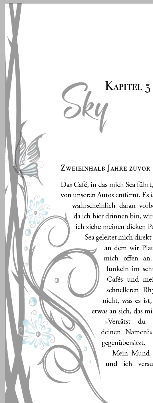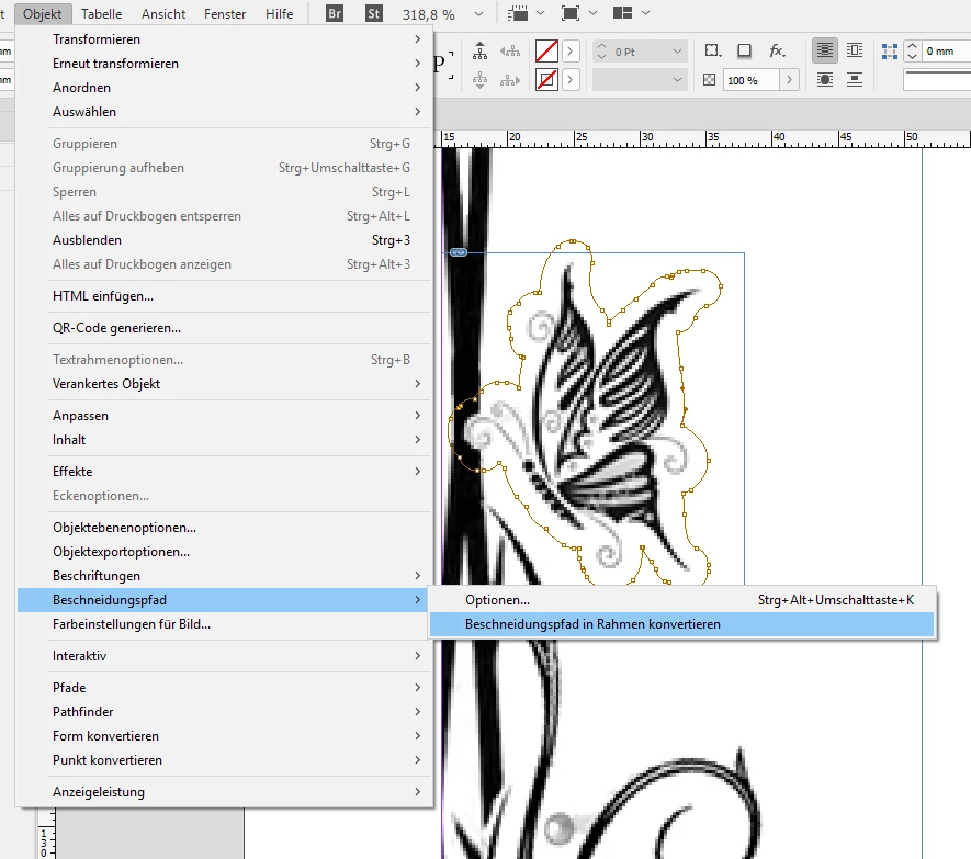 Ich weiß, wie man Text um Bilder fließen lassen kann, aber wie mache ich das, wenn ich 2 Bilder übereinander habe? Zur Veranschaulichung habe ich 2 Bilder angehängt. Das erste wurde in Word erstellt. Der Schmetterling (ein separates Bild) wurde so über eine Blumenranke gelegt, dass die Ranke, dort wo der Schmetterling liegt, nicht mehr zu sehen ist. So ähnlich wie Textfluss oder Padding bei einem Bild. Aber ich weiß nicht, wie das in IDD geht (siehe 2. Bild). Ich kann natürlich den Schmetterling über die Ranke legen, aber wie bekomme ich es hin, dass um den Schmetterling ein weißer Rand entsteht und die Ranke dahinter „verschwindet“? Ich hoffe, ich habe mich verständlich ausgedrückt.