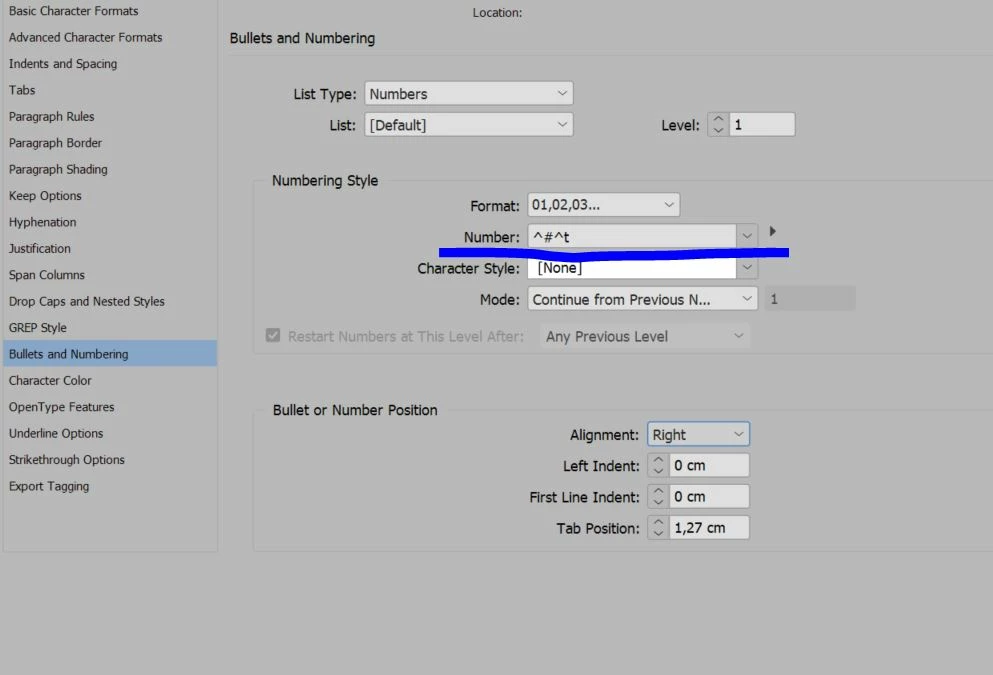 Does anyone know how to set numbering on the right side in Paragraph Style? I assume I need to write the right code here to achieve it?
