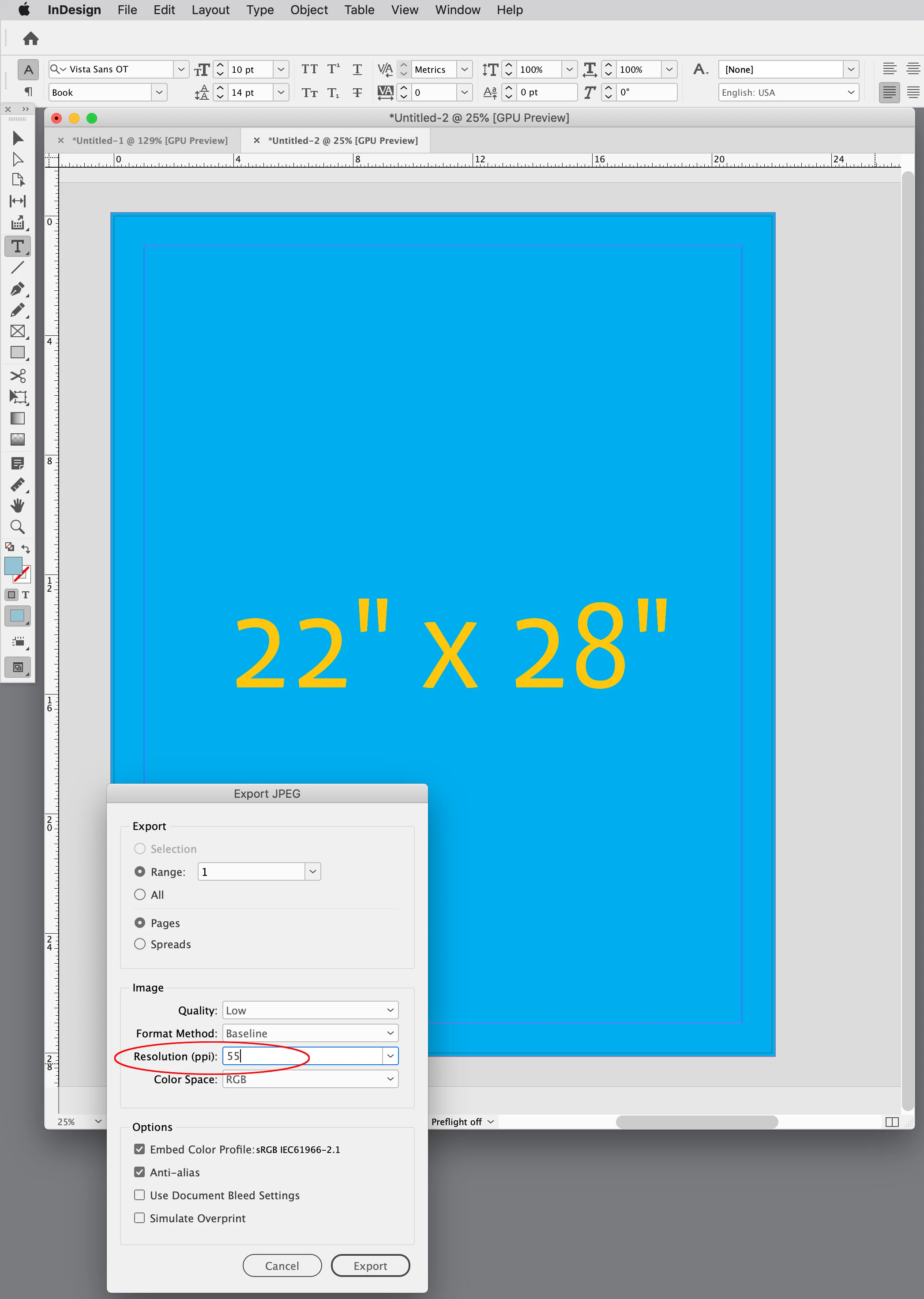 So...I had no idea how to calculate what resolution I should export as, but online I found that if you want to print a 22”x28” and you want the resolution to be 300 PPI, then you multiply the inches by PPI amount (PPI is just the resolution, right?) and that gives you the pixel amount. So, if the width of this poster is 22inches, then I'd take 1200 (the width of the final JPEG image) and divide by 22, right? That gives me 55. Should 55 be the resolution? It seems awfully low!