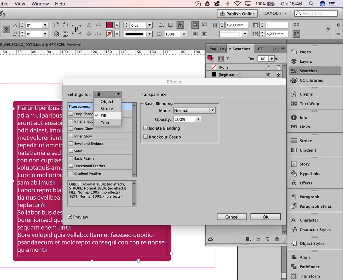 I have a photograph in the background of the page. Over the top of the photo I would like to place text inside a box that has white fill color set to 80% opacity. I normally create a separate object for the box, set its fill to white and adjust its opacity, then place my text on top of the box and adjust the box size to fit the text correctly. Using two separate objects takes more time.