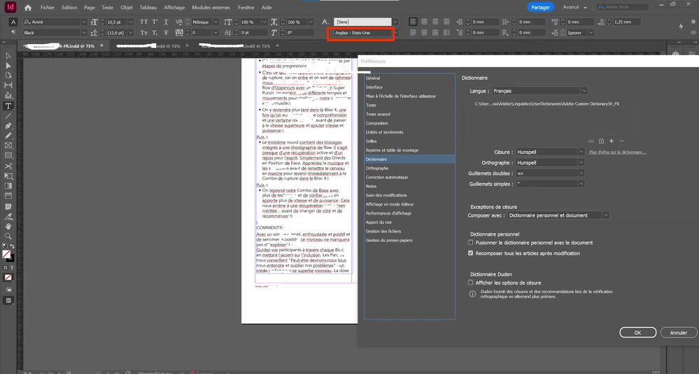 I often work on InDesign documents that are written in English. I translate the content into French on the same document. I can't change the language of the dictionary in order to launch the through spell checker.