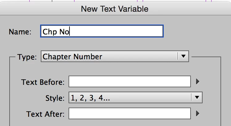 In addition, create the text variable as Barbara showed you, for the Chapter Header