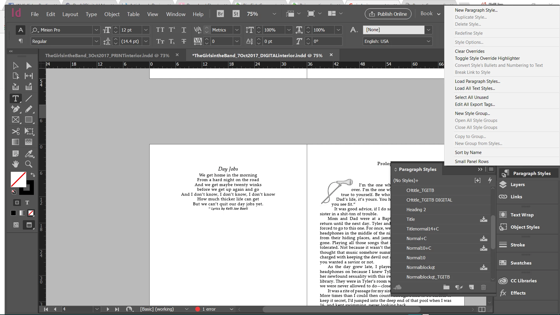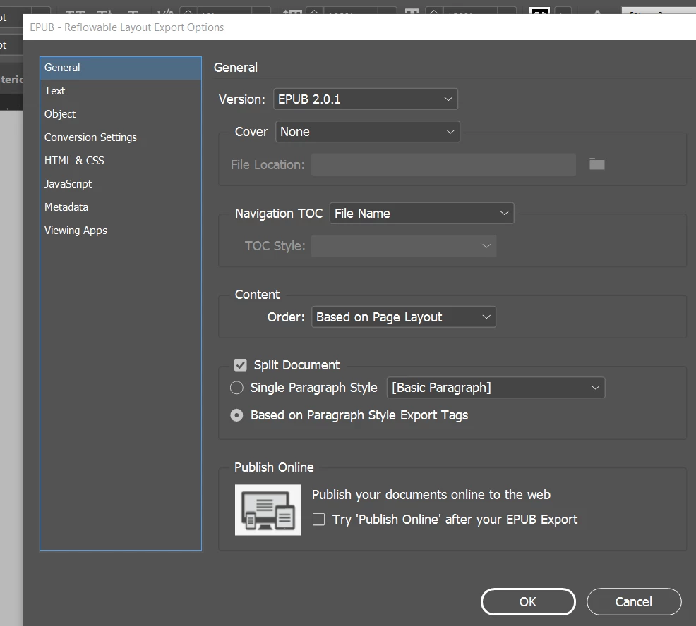 What i was doing before this happened: the tiny symbol (c) at the top had a style applied to it, (so that i could get that page to start on a separate page, in other version) and i decided to get rid of the symbol graphic and just use some kind of text there. I applied the new style, which was the same as all my other chapter headings that break to the next page just fine, and since i did that, the copyright page does not show up AT ALL in the epub file. It's just gone. I did this again, checking all the settings, and the same thing happened. Anyone know how this could happen? Below are the screenshots of my settings.