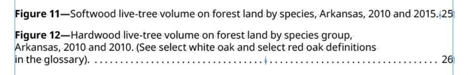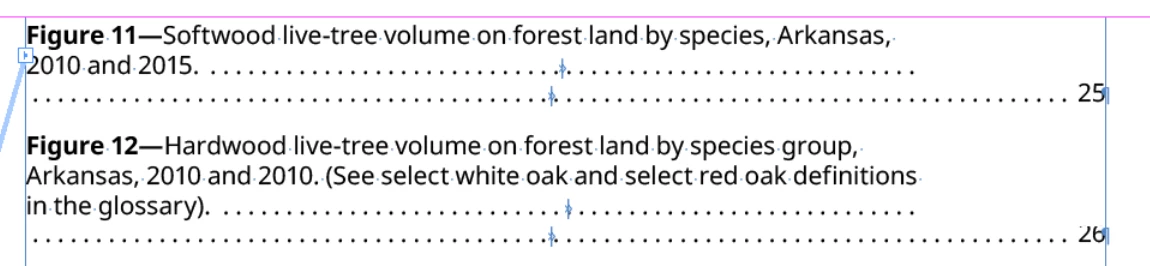 I'm making a list of figures using the table of contents tool and wanted to keep the text from going all of the way to right side so that the page numbers are seperated from the text. In the paragraph style for the TOC entry I added a right indent of 1" with a last line indent of -1". This worked for most of them(like figure 12) but for a couple of entries(like figure 11) the last line of text ended up running really close to the page number.