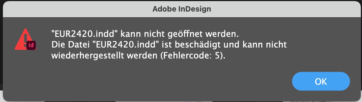 EUR2420.indd kann nicht geöffnet werden. Die Datei ist beschädigt und kann nicht wiederhergestellt werden (Fehlercode: 5)