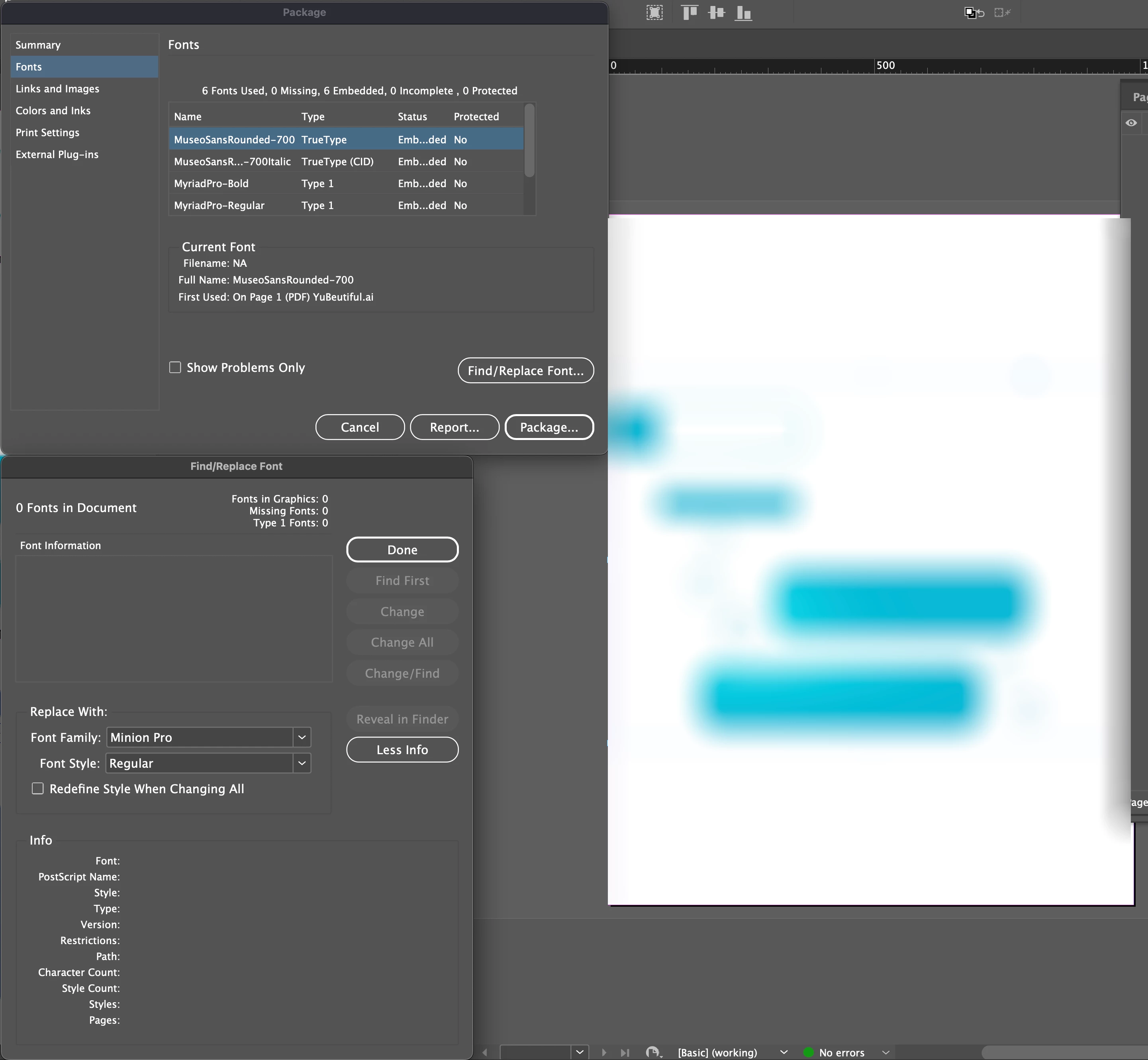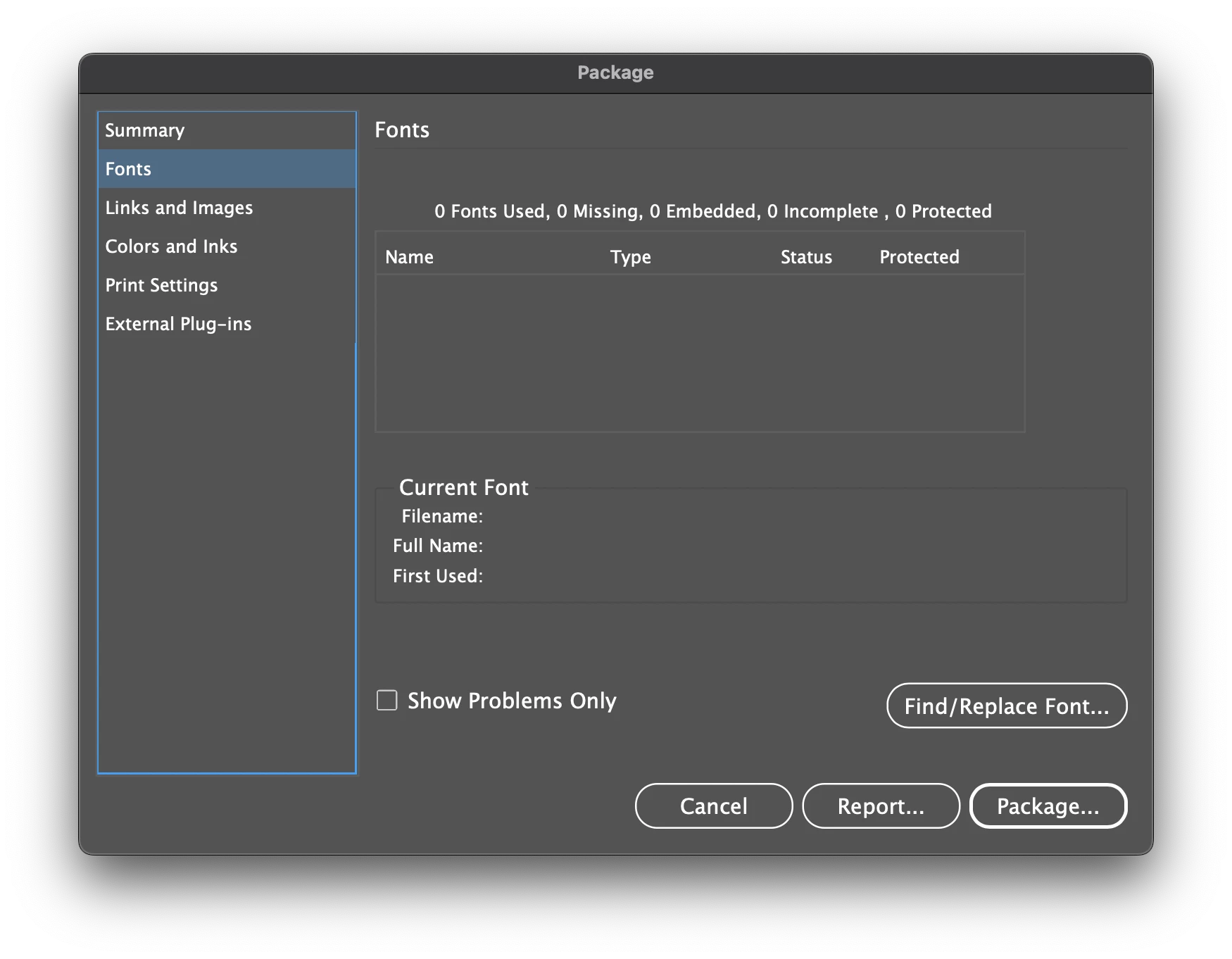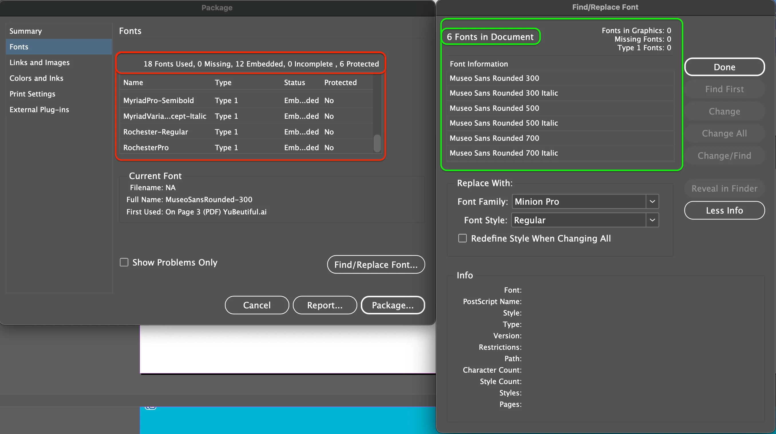 I'm debugging a document and removing everything that's not required, and when I check, using the "Find/Replace Font" window, the fonts used in the document appear to be 6, but when packaging, in the "Fonts" section, it says there are 18! When I select one of the ones I don't recognize and request its location in the document, it doesn't appear in the "Find/Replace Font" window, and if it doesn't appear, it can't show me where it "supposedly" is located in the document.