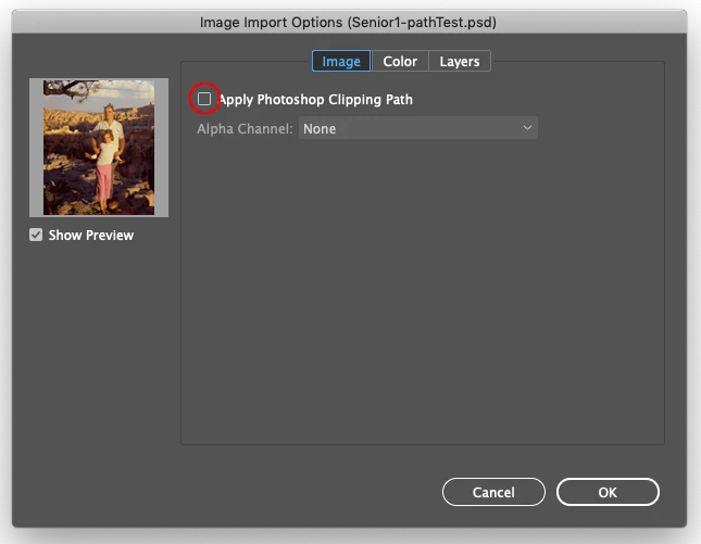 2. In the Place dialog, hold down the Shift key and double-click on an image with a clipping path to open the Import Options dialog.