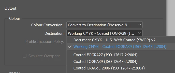 I have exported a 60pg Indesign doc to PDF, but the printers have come back and said they are unable to convert 1 page to cmyk satisfactorily. Below are the output options I have chosen but don't seem to be working.