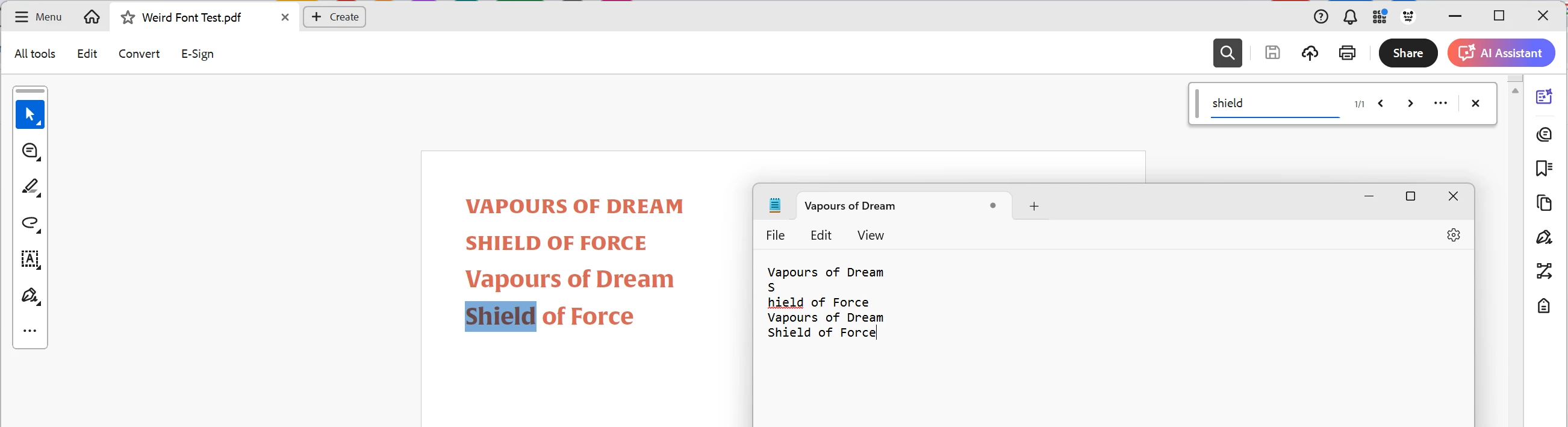 - The result of cutting & pasting the complete PDF text into a text editor. Note the extra newline in the first instance of "Shield". It seems this is what prevents search from finding that instance of the word.